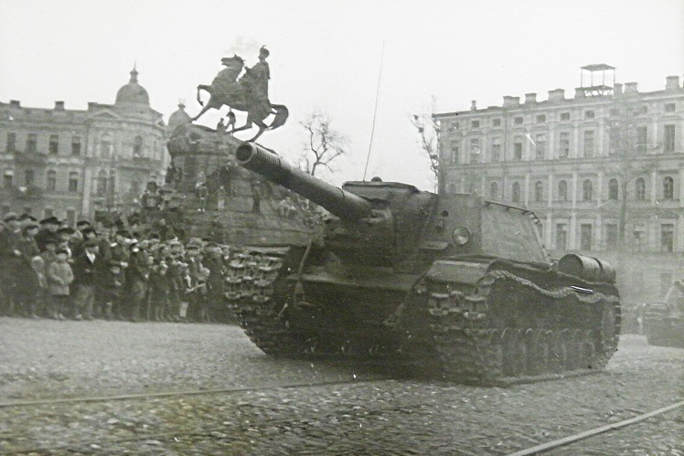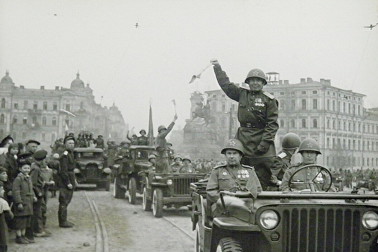 Демонстрація і військовий парад на площі Богдана Хмельницького (нині Софійська площа) в Києві на честь перемоги над Німеччиною у Другій світовій війні, 9 травня 1945 року.