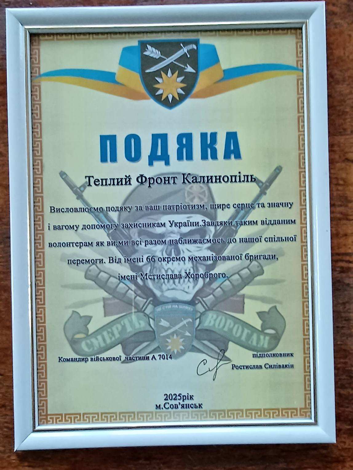 Так, зокрема, волонтерам осередку «Теплий фронт» з Калинопільщини надійшла офіційна подяка від командування та бійців 66-ї ОМБ імені Мстислава Хороброго за «патріотизм, щире серце та значну і вагому допомогу».