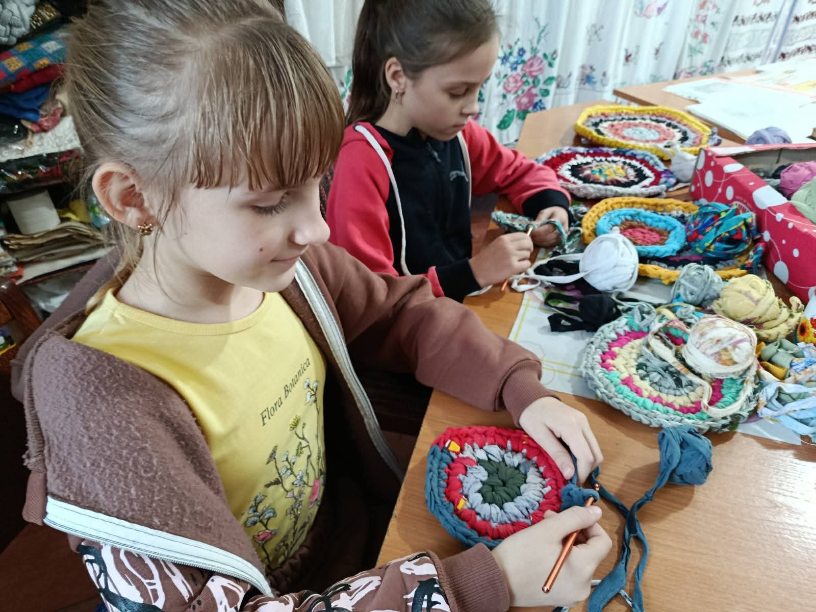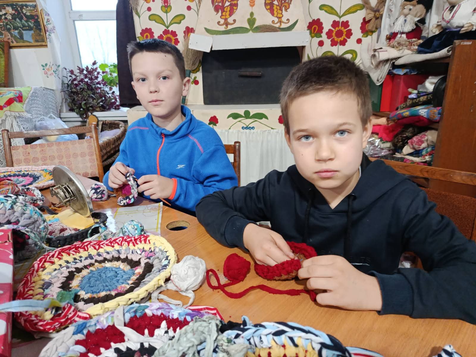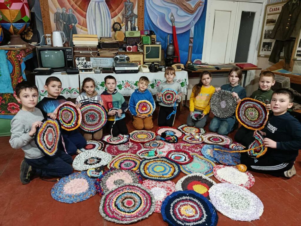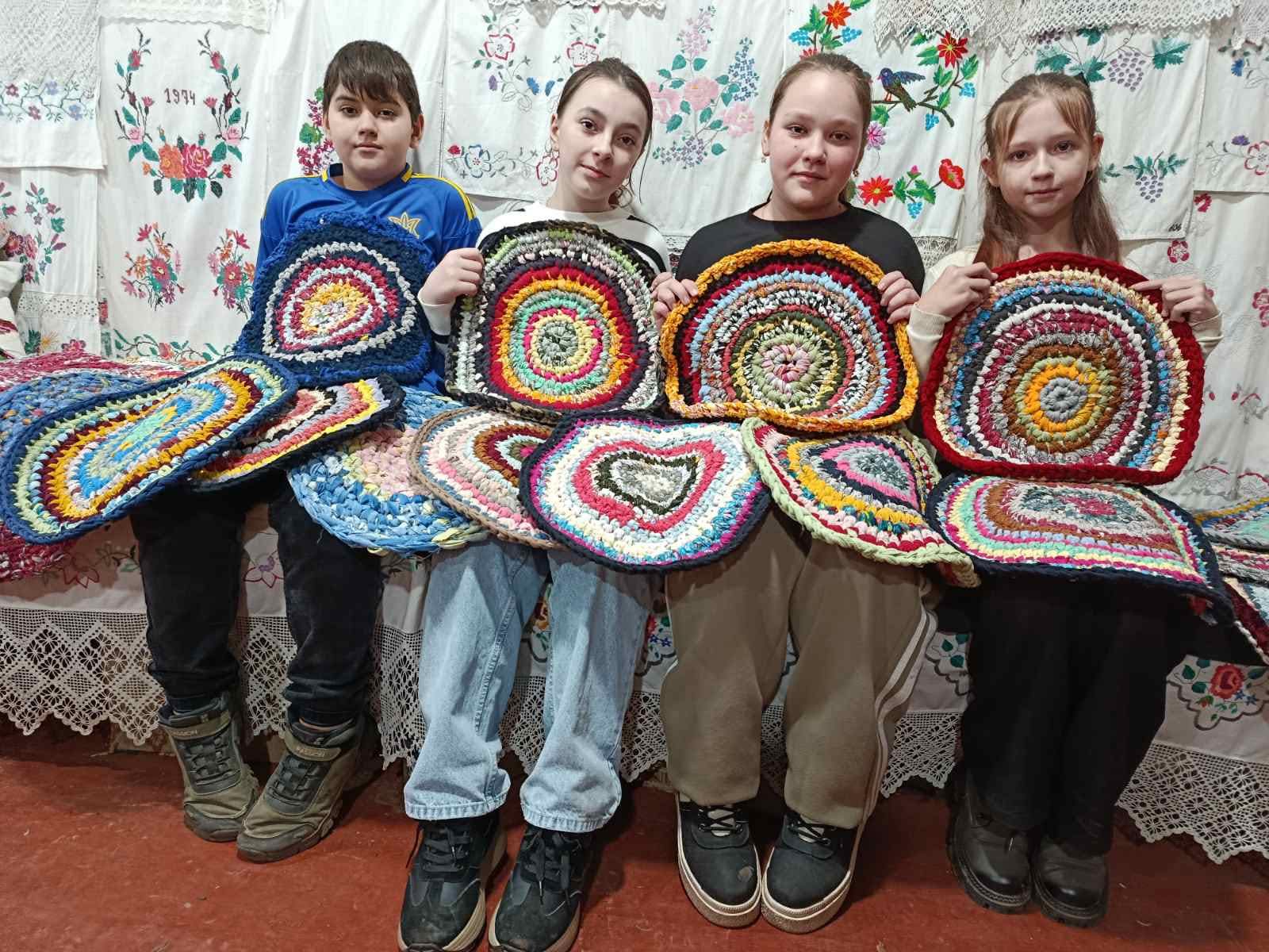 Маленькі волонтери-бджілки, учні 2-5 класів Мокрокалигірського ліцею, що на Калинопільщині, разом зі своєю феєю-чарівницею-наставницею, очільницею місцевого музею культури та побуту Людмилою Дідук готують подарунки для військових до зимових свят: в’язані килимки для сидіння, малюнки тощо. Важливо, що килимки діти виготовляють своїми руками, вкладаючи в них позитив, любов та безмежну турботу. Сумлінно працюють і хлопчики, і дівчата. Людмила Тимофіївна їх навчає та забезпечує матеріалом.