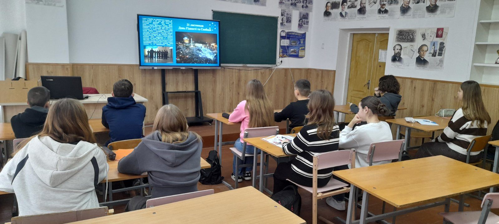 «Під час зустрічі учні разом із учителем обговорили глибинний зміст свята, яке вшановує патріотизм і незламний героїзм громадян, – розповідають у ліцеї. – Вони наголосили на важливості захисту демократичних цінностей, прав і свобод людини, а також незмінності європейського вибору нашої держави. Особливе місце в обговоренні посіло усвідомлення того, якою високою ціною виборювалася можливість жити у вільній і незалежній Україні. Школярі переглянули історичні кадри та матеріали, які нагадали про самопожертву учасників революцій».