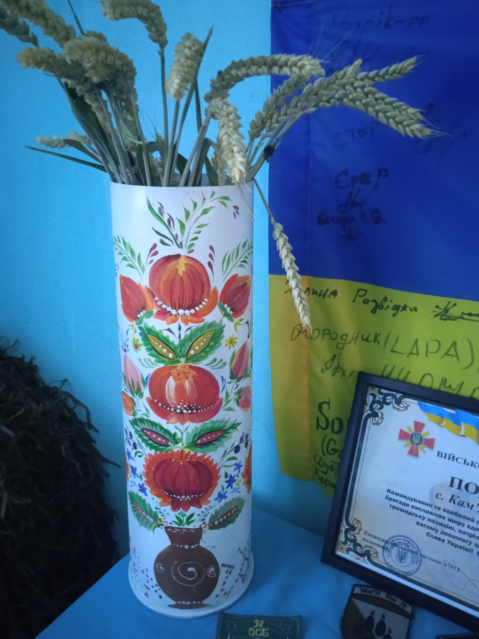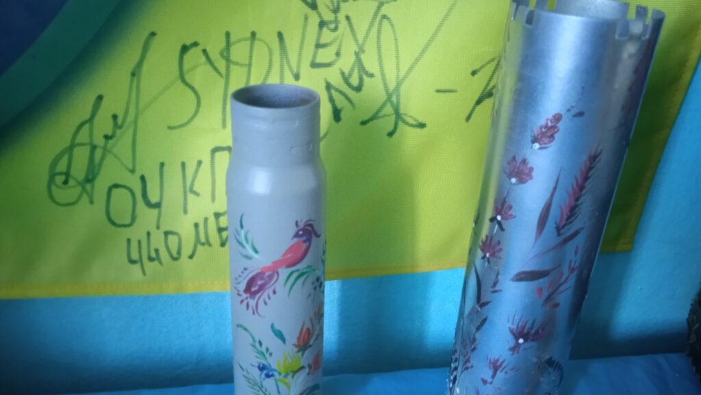 незвичайні експонати – гільзи від снарядів, які передали з фронту жителі села, які сьогодні відстоюють незалежність України на різних фронтах. А місцева майстриня Любов Фролова вирішила, як вона каже, «смерть перетворити на життя».