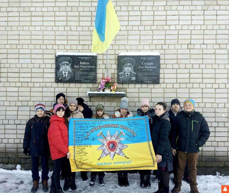В пам’ять про полеглих друзів, земляків з Лисянки Олега Коваля та Олега Стукала, що служили офіцерами у 128-й окремій гірсько-піхотній бригаді і загинули при виході з-під Дебальцевого у 2015 році, волонтер Олег Ганжа 11 грудня передав у Лисянку привезені з фронту два стяги з підписами військових 128-ї ОГПБр. Один прапор розмістили в районному історичному музеї Лисянки, інший передали в місцеву ЗОШ №2 (на знімку), де свого часу навчалися герої.