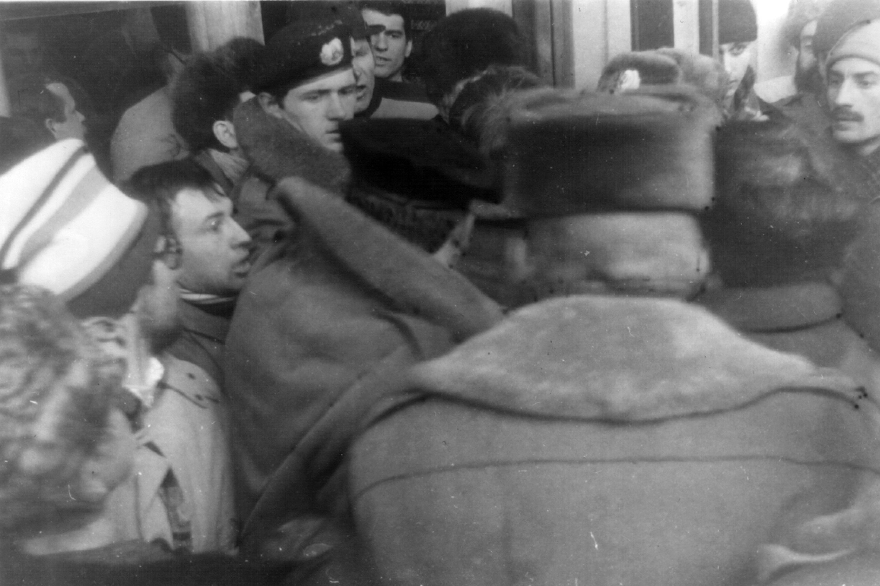 Міліція відтісняє пікетувальників донецького осередку «Народного руху» під час конференції КПУ в Макіївці, березень 1993 року.