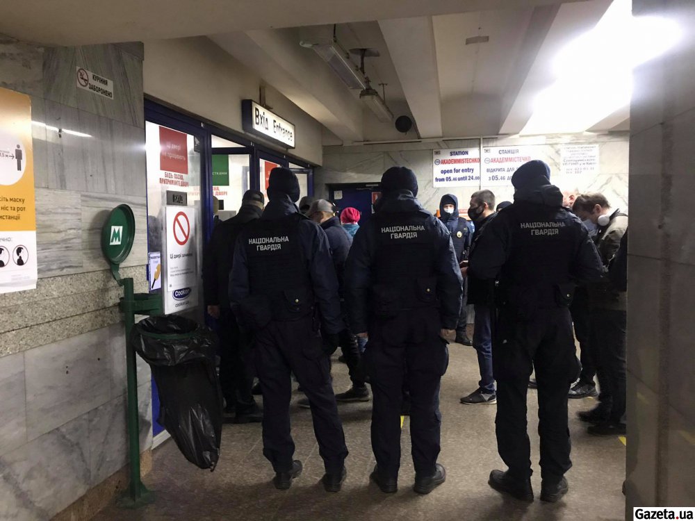 На станції Академмістечко на входах до підземки чергують із десяток бійців Національної гвардії та поліцейських. Крім перепусток перевіряють у людей посвідки особи – паспорти, водійські права, повідомляє кореспондент Gazeta.ua.