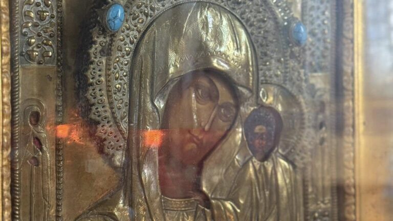 Після переходу громади Свято-Михайлівського собору до Православної церкви України зникла Казанська ікони Божої Матері. Замість неї залишився лише плакат із зображенням святині.