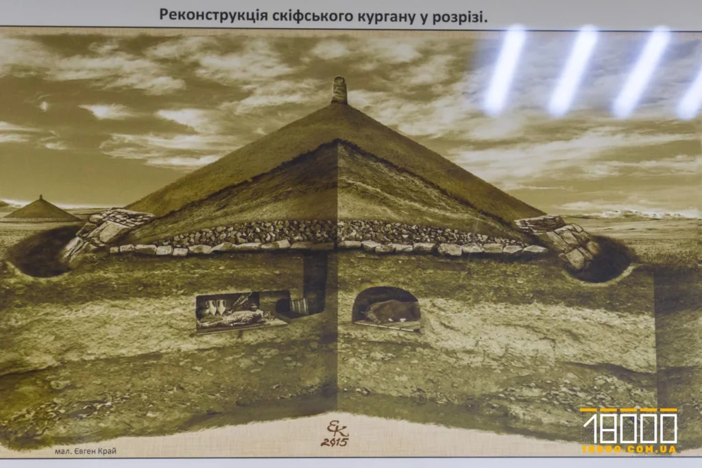 – Вони зайшли із сусідньої могили царського коня шестиметровим підземним ходом. Зайшли там, де були ноги царя і лежав його зброєносець. Від царя залишилась тільки частина скелета і бронзовий пояс. Від цариці — майже нічого, — пригадує пан Михайло. У могилі було три тайники. Один з них був пограбований.