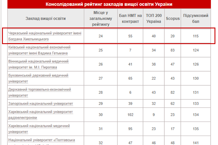 Черкаський національний університет імені Богдана Хмельницького піднявся на шість сходинок у рейтингу й увійшов у тридцятку кращих закладів в Україні.