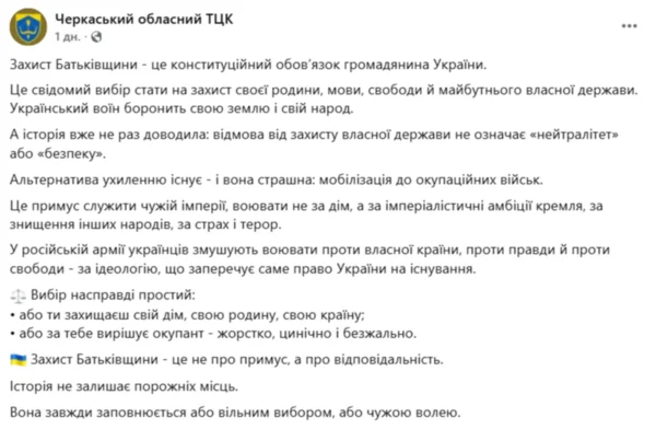 У тексті до самого допису йдеться, що захист України — конституційний обов’язок кожного громадянина. Також у ТЦК розказали про “альтернативу ухилення” від служби у лавах ЗСУ.