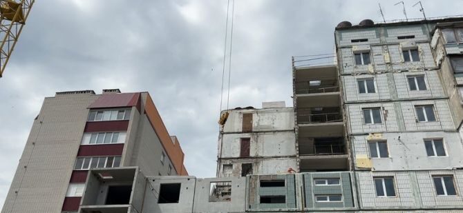 У зруйнованому під’їзді багатоповерхівки зводять шостий поверх, пояснив майстер будівельної організації Олександр Черниченко.