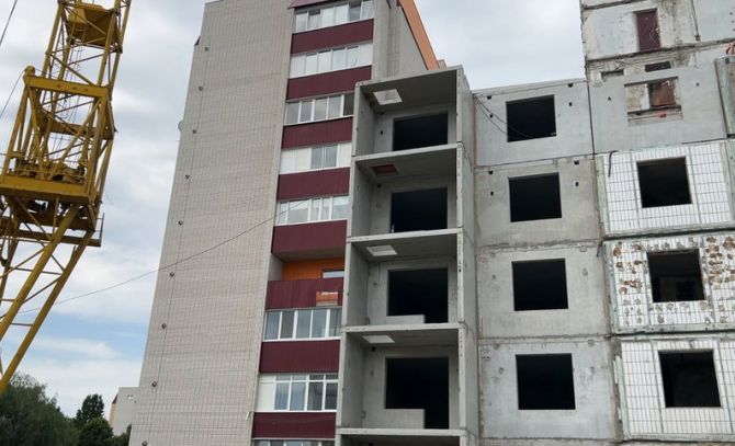 “Зараз ми почали монтувати шостий поверх, це те, що зовнішні плити, продовжуємо утепляти фасад, задню сторону і почали сантехнічні роботи робити, зробили вже підвал і від завтра починаємо перший-другий поверх. Електрику ми вже розкидали по дев’яти поверхах”.