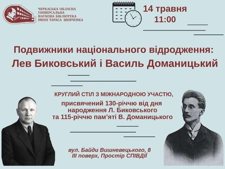 14 травня на Черкащині провели круглий стіл з міжнародною участю «Подвижники національного відродження: Лев Биковський і Василь Доманицький», організований Черкаською обласною універсальною науковою бібліотекою імені Тараса Шевченка.