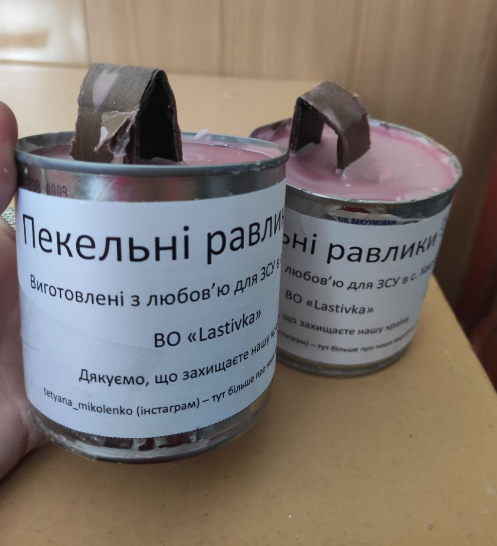 «У перший тиждень повномасштабного вторгнення, коли мільйони виїжджали з країни, моя тітка Юля, навпаки, повернулася з Польщі із заробітків. Аргументувала це тим, що ми всі тут, а вона там. Вважала, що в Україні принесе більше користі, тому це рішення навіть не обговорюється, – говорить Тетяна. – Тітка Юля й виплекала ідею виготовляти окопні свічки. На той час вона вже працювала в нашій сільській школі завгоспом. І закипіла робота. Я через соцмережі збирала, шукала віск, парафін і тару, а працівники школи крутили равлики й заливали їх парафіном. Пам’ятаю, як ходила по всьому своєму району й збирала по декілька недопалків свічок та бляшанок з-під консервів. Дехто давав і гроші, які я потім клала на монобанку. Так і виник наш мінібренд «Пекельні равлики». Загалом ми виготовили близько 5 тисяч окопних свічок, але це приблизні цифри. Не завжди мали час їх перераховувати».