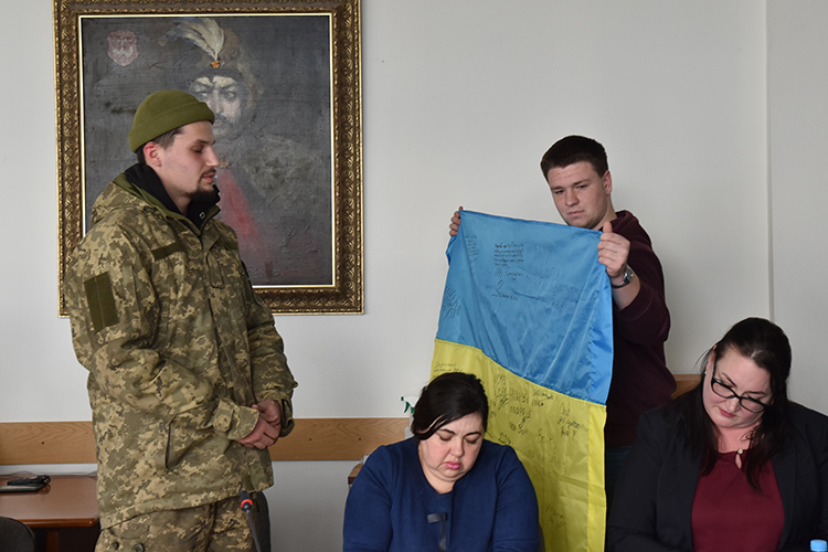 Присутні були дуже схвильовані виступом Назара Радкевича (студента 2 курсу спеціальності 014.03 «Середня освіта (Історія)», воїна ЗСУ), який перебував на ротації і зміг прийти до університету особисто. Хлопець розказав, що почав цінувати тишу, спокій, дуже багато речей переосмислив із початком широкомасштабної агресії. «Найбільш шкода, що з боку України гинуть справжні патріоти, цвіт нації, а з боку росії — злочинці, збоченці, наркомани, алкоголіки. І це складно прийняти» — поділився Назар. Він втратив на війні багатьох друзів, але багато і знайшов справжніх побратимів. Подякував студентській родині, викладачам за підтримку. Передав рідному університету та інституту прапор України з побажаннями Перемоги, подяки від своїх побратимів.