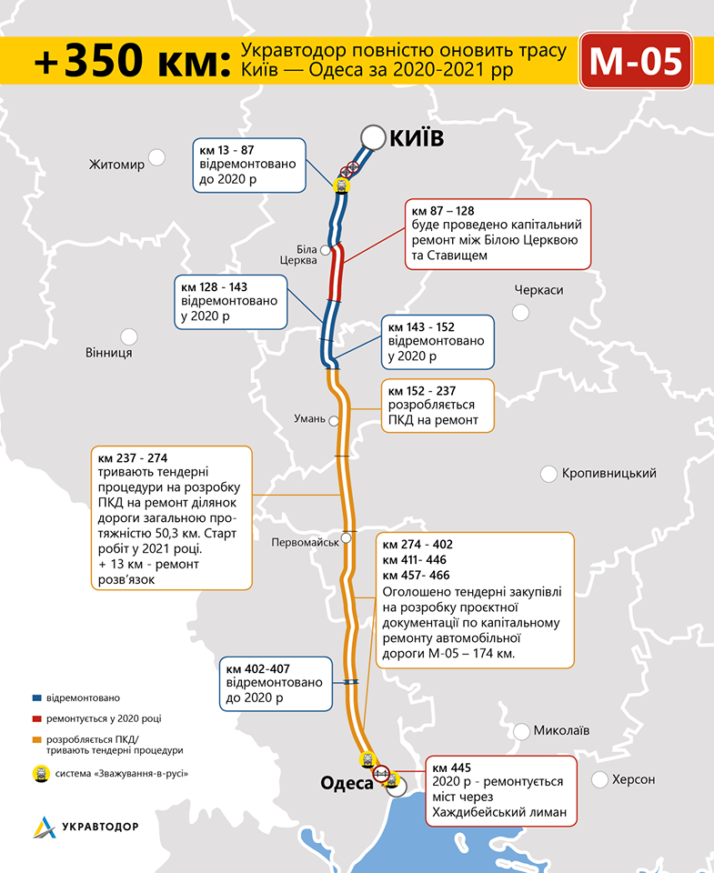 Дорога М-05 Київ – Одеса була побудована у 50-60-х роках минулого століття. Є частиною міжнародного транспортного коридору Е95 Гельсінкі – Київ – Одеса – Димитровград – Александруполіс і проходить через Київську, Черкаську, Кіровоградську, Миколаївську та Одеську області протяжністю 504,6 км.