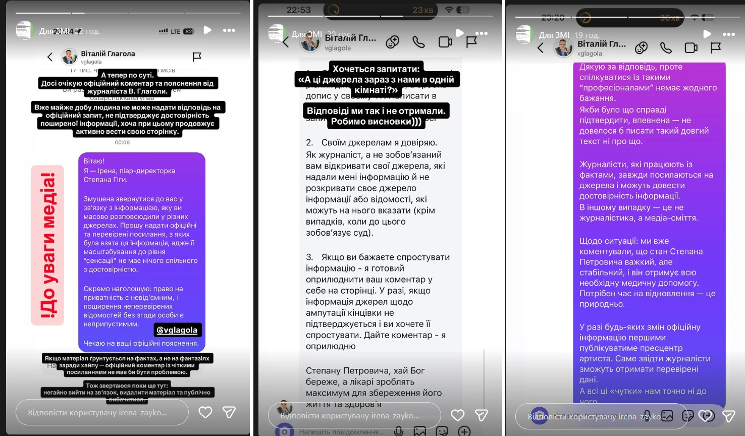 Піар-директорка опублікувала скриншоти переписки з журналістом Віталієм Глаголою, який раніше повідомив, що Степан Гіга впав у кому. Як видно зі скриншотів, Ірена Зайко звернулася до журналіста із запитом, у якому вимагала або надати докази його інформації, або видалити матеріал і публічно перепросити.