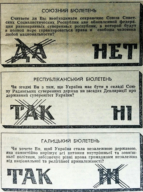 17 березня 1991 року мешканці Івано-Франківської, Львівської та Тернопільської областей отримали одразу три бюлетені: білий — для всесоюзного референдуму, сірий — для республіканського опитування та рожевий — для регіонального. На запитання про незалежність України 88,3% учасників у західному регіоні відповіли “так” (у різних областях показник коливався від 87% до 90%).