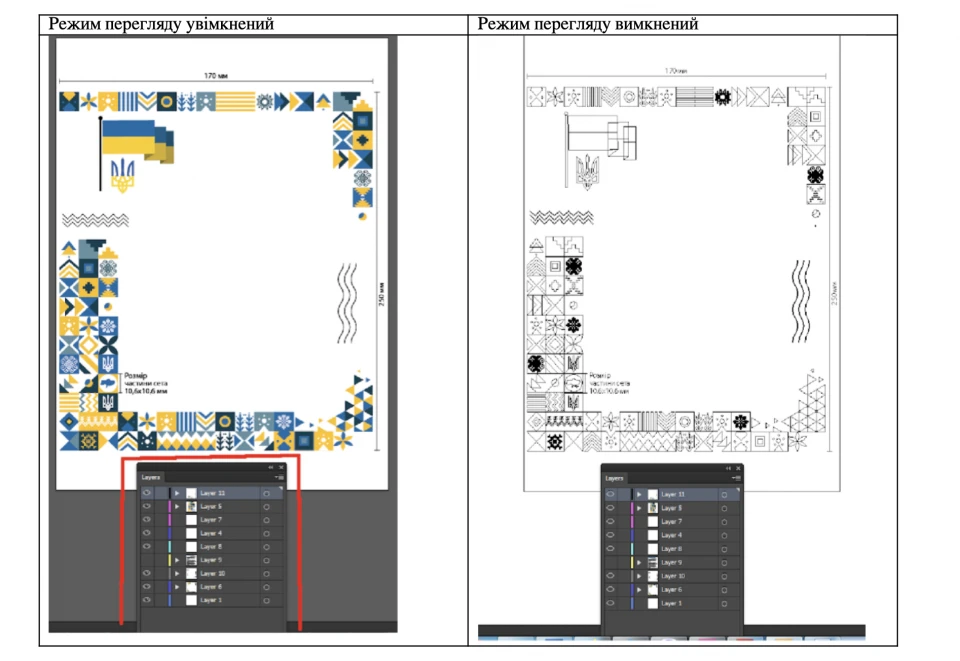 На першому етапі роботи дизайнери скопіювали на сторінку 2 сети з великою кількістю елементів. Далі, вони показали, як програма Adobe Illustrator працює з векторними об’єктами: їх розміщують на різних шарах.