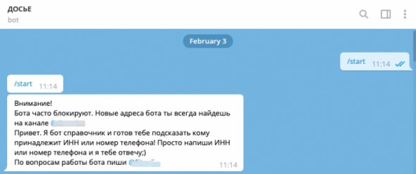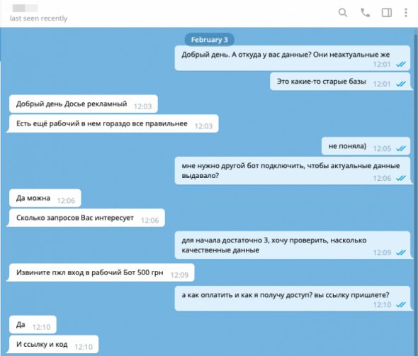 Бот називається “Досьє”. За номером телефону або ІПН людини він видає паспортні дані, прописку, адреси електронної пошти і навіть досьє на родичів. Такий набір даних обійдеться від 9 до 15 грн в залежності від підписки, яку бот пропонує оформити, пише ain.ua.