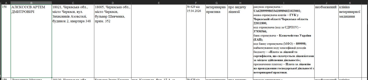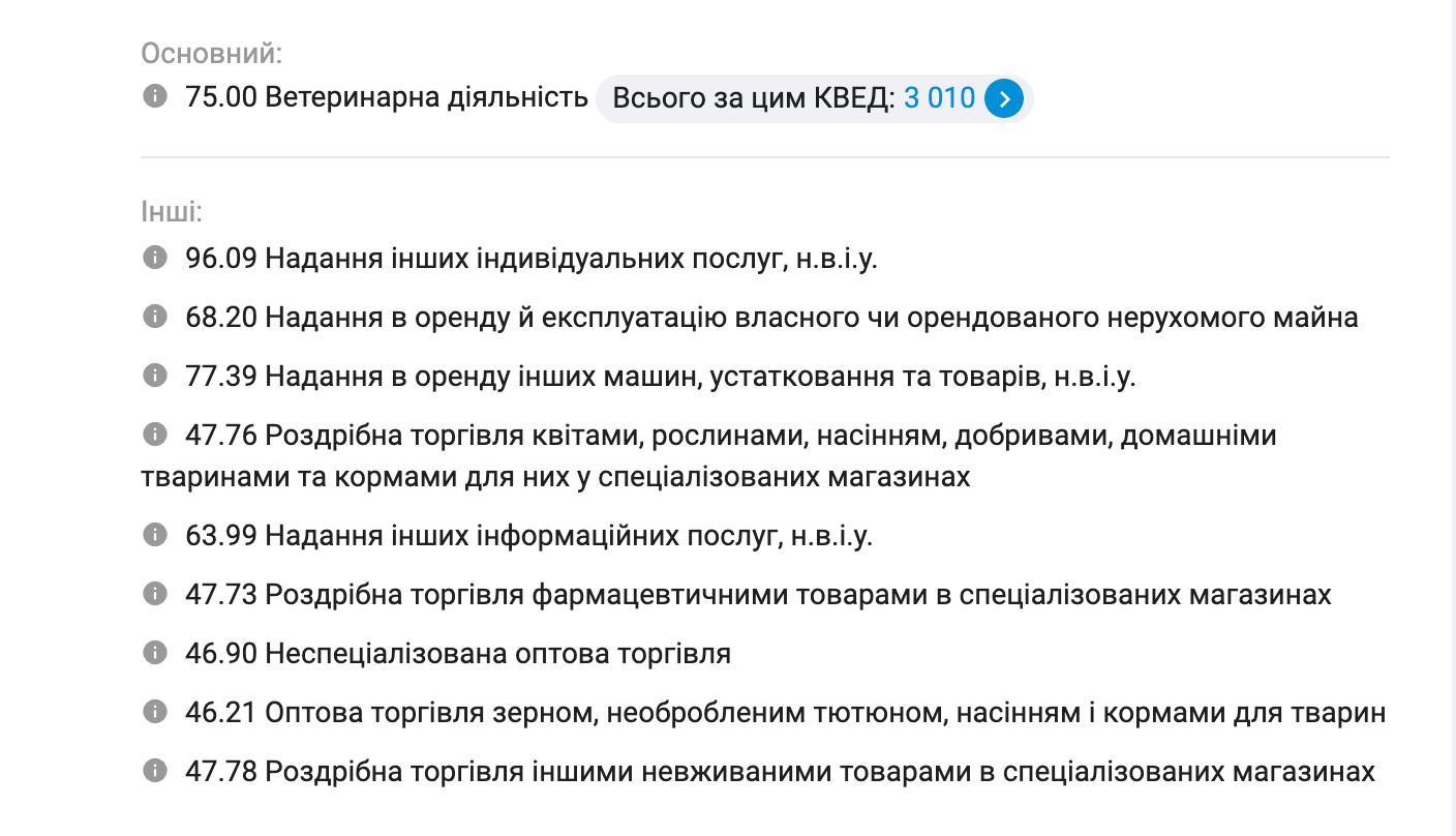 Також місяць тому на ім’я чоловіка з’явився ФОП у Черкасах з відповідним КВЕДом на ветеринарну діяльність.