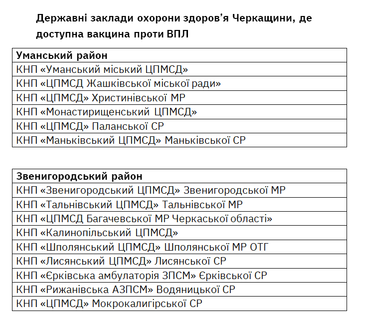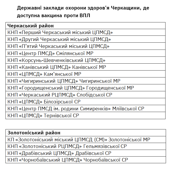 У медзакладах Черкащини можна зробити щеплення проти вірусу папіломи (перелік)