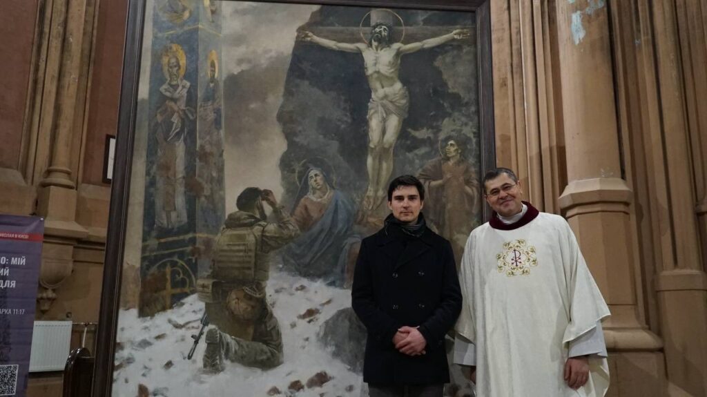 У Києві презентували картину «Молитва» художника Івана Волошина. Полотно, що зображає українського воїна на тлі зруйнованого храму, передадуть Папі Римському як знак віри та стійкості українського народу.