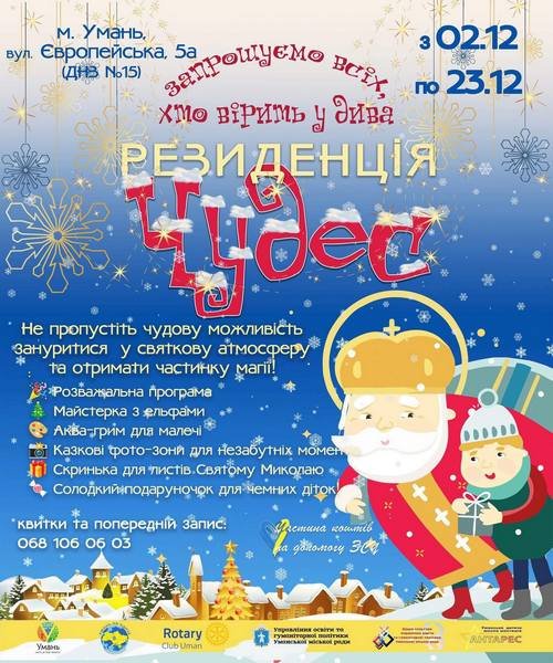 З 2 по 23 грудня в Умані працюватиме “Резиденція чудес”. Про це розповіли у пресслужбі міської ради.