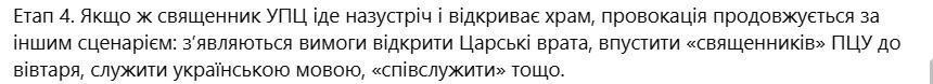 Також там додали, що представник УПЦ МП Андрій Глущенко детально проаналізував схему провокацій і одним з пунктів, як провокацію вказали – служіння українською мовою.