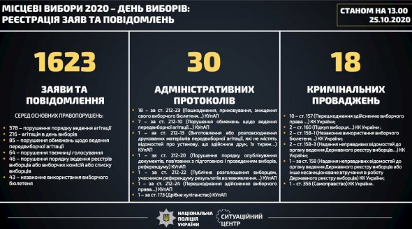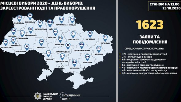 Станом на 13:00 поліція зафіксувала 1623 заяв та повідомлень, пов’язаних із виборчим процесом.