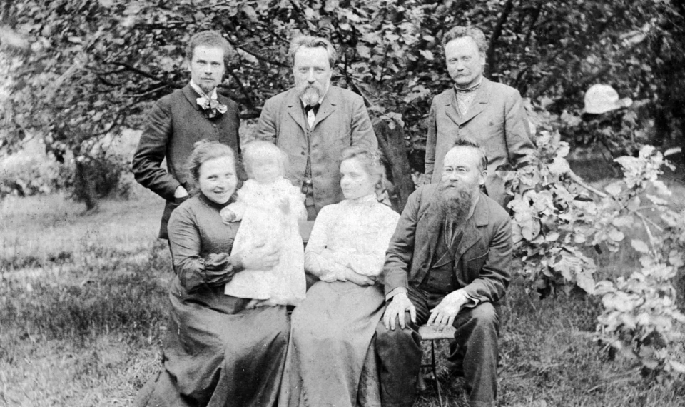 Сидять зліва направо: Марія Грушевська з донькою Катериною, Стефанія Левицька, Михайло Грушевський. Стоять: Іван Труш, Северин Данилович та Іван Франко, фото: Історико-меморіальний музей Михайла Грушевського