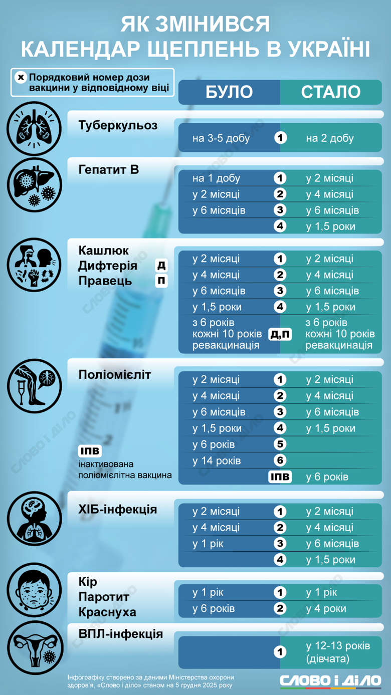 Згідно з рішенням Міністерства охорони здоров’я, оновлений Календар профілактичних щеплень почне діяти з 1 січня 2026 року і включатиме 11 інфекційних захворювань. Ще одне з важливих нововведень – у наступному році планується повний перехід на інактивовану поліомієлітну вакцину (ІПВ).