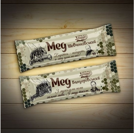 Перша партія меду, а це приблизно 25000 стіків, буде передана українським захисникам вже найближчим часом. На стікерах – портрети діячів та їхні цитати, щоправда перефразовані: “Борітеся – поборете, а мед допоможе!” – на “Шевченківському” меді та “З моск*@лями нема спільної мови. І меду також”, – на “Бандерівському”.