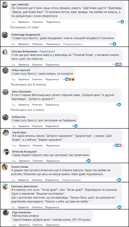 “У нас ще досі жартома кажуть у відповідь на “Помагай Боже” у множині: казали боги, щоб і ви помогли”, “На Галичині ще й нині, якщо хтось працює, кажуть: “Дай Боже щастя!” Відповідь: “Дякую, дай Боже Вам!”. По великих містах, вже, правда, так майже не кажуть, а по райцентрах і селах збереглося”, “А дядьки при зустрічі вітаючись ще й знімали картуза. Зараз так майже не роблять. Можливо ще десь на заході країни. Мені дуже подобається”, “Серед людей старшого віку ще частенько такі привітання”, — пишуть у коментарях.