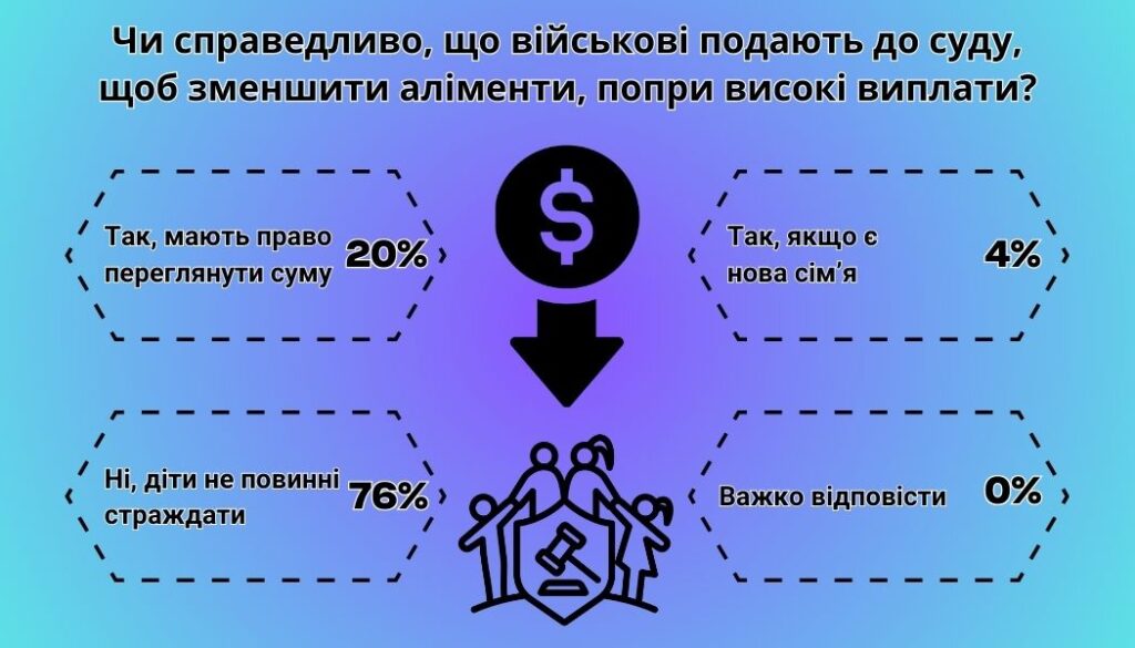 А що думає про це суспільство? Ми вирішили запитати мешканців Тальнівщини: чи вважають вони справедливим, коли батько після мобілізації намагається зменшити суму аліментів, навіть маючи стабільний дохід? Більшість респондентів наголосили, що незалежно від статусу чи обставин, дитина має отримувати належне утримання. Адже війна не знімає з батька відповідальності перед власною дитиною. Результати опитування – нижче в інфографіці.