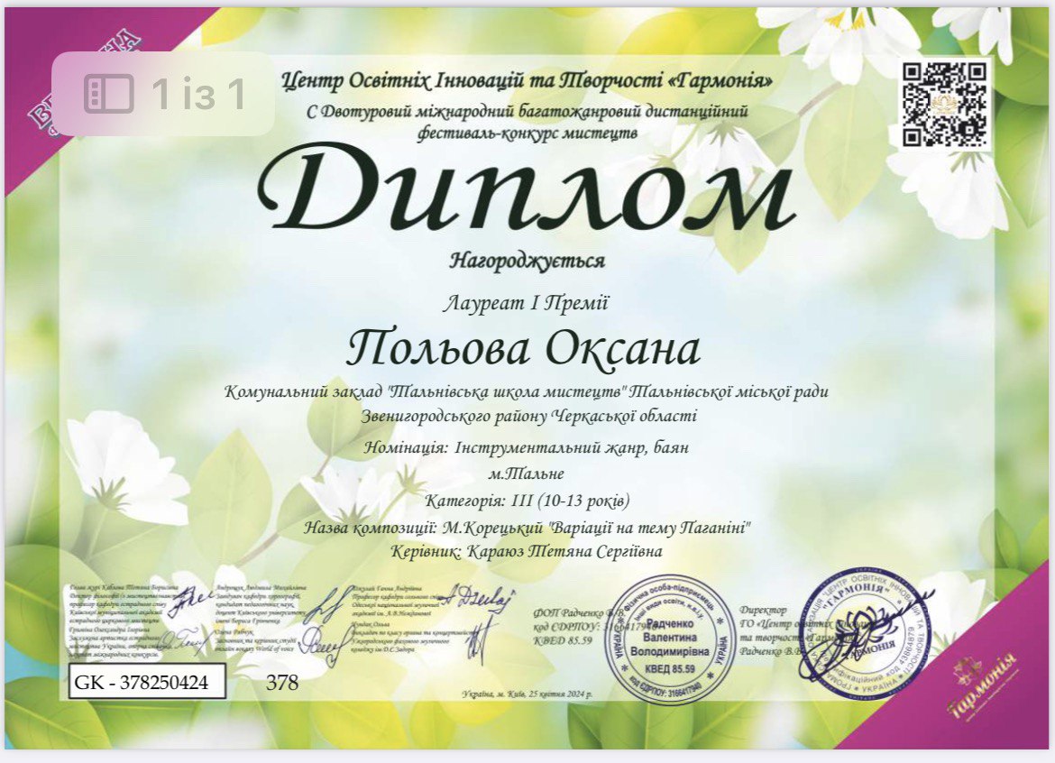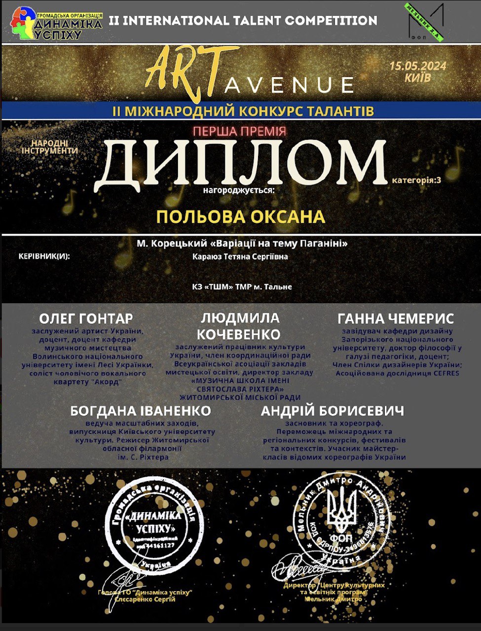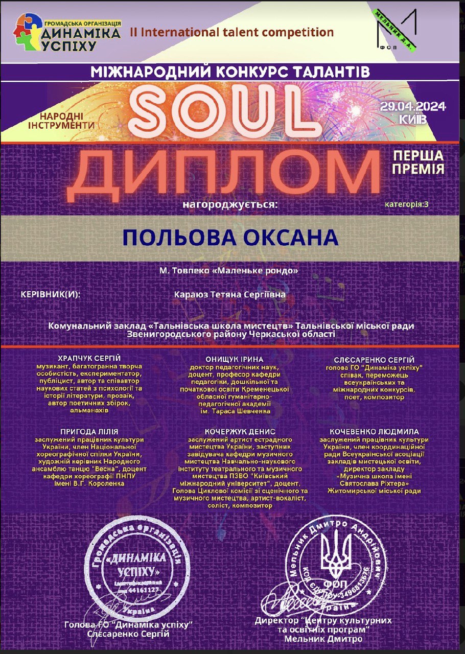 «Батьки радо підтримали моє бажання й записали мене до першого класу Мошурівського філіалу Тальнівської музичної школи, – з теплом згадує Тетяна. – Пам’ятаю, як мене зустріла викладачка Ірина Сипченко. Вона першою побачила в мені музичний хист, відзначила гарний голос і привила справжню любов до музики. Звісно, спочатку було непросто. Мене майже не видно було за інструментом, доводилося нелегко поєднувати навчання й репетиції. Були хвилини, коли здавалось, що варто здатися. Але Ірина Юріївна завжди була поруч, її підтримка надавала сил іти далі. Завдяки їй я навчилася вірити у власні здібності, перемагати на змаганнях музикантів й упевнено продовжувати обрану справу».