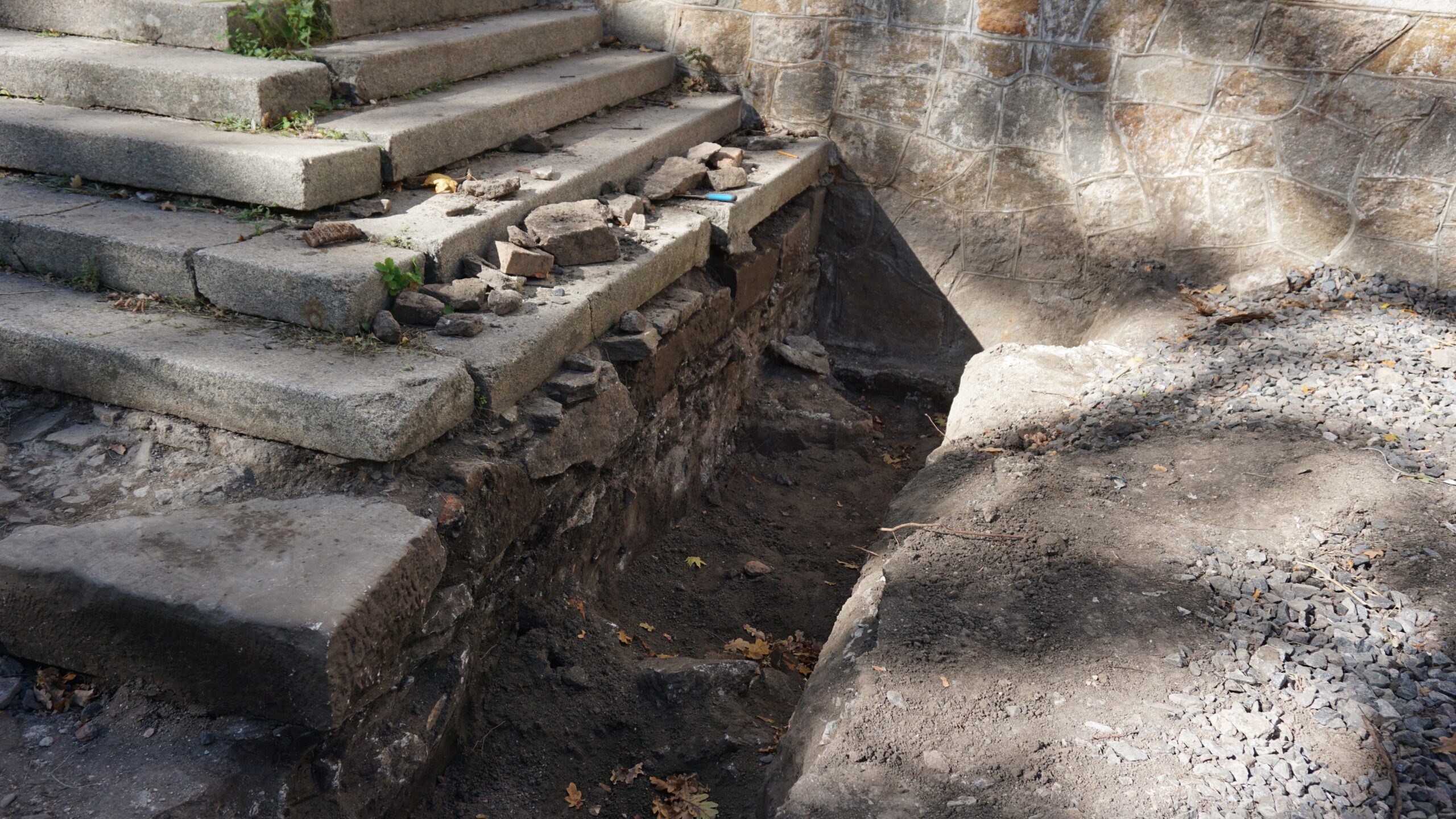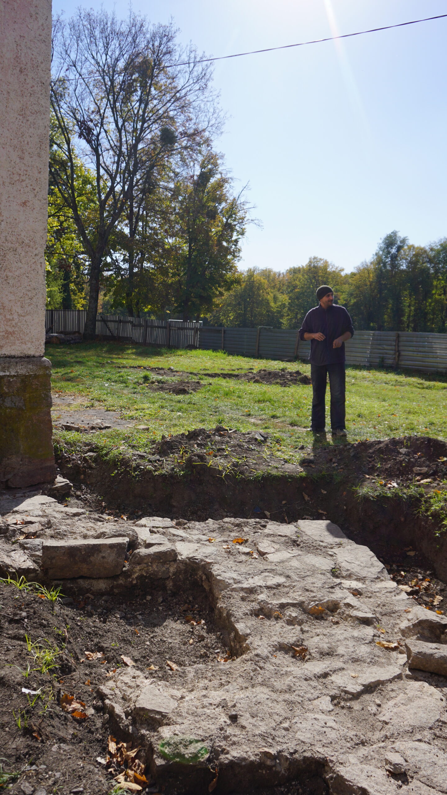 Так, ми побачили, що нині роботи біля палацу у самому розпалі. Довкола будівлі проводять обстеження фундаменту. Розкопують його та досліджують, де рівень землі по периметру фундаменту був піднятий, тут його потрібно буде відкопувати, а де опущений – підсипати.