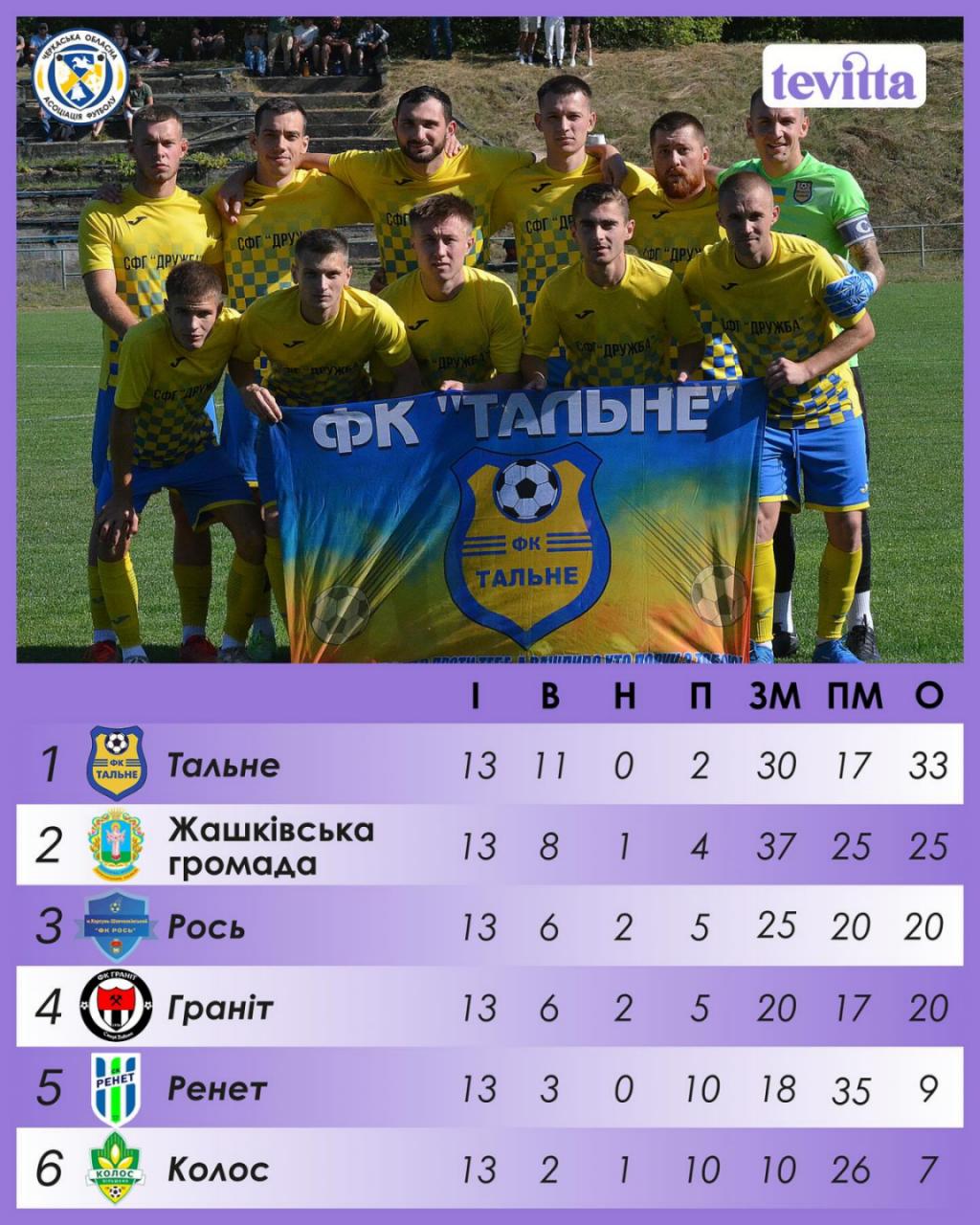 Футбольний клуб «Тальне» за два тури до завершення чемпіонату достроково став чемпіоном Черкаської області (Tevitta-Ліга)! Команда з Тального впевнено пройшла сезон, показавши сильну гру, витримку та справжній спортивний характер. Це – заслужене чемпіонство, яке увійде в історію Тальнівського футболу!