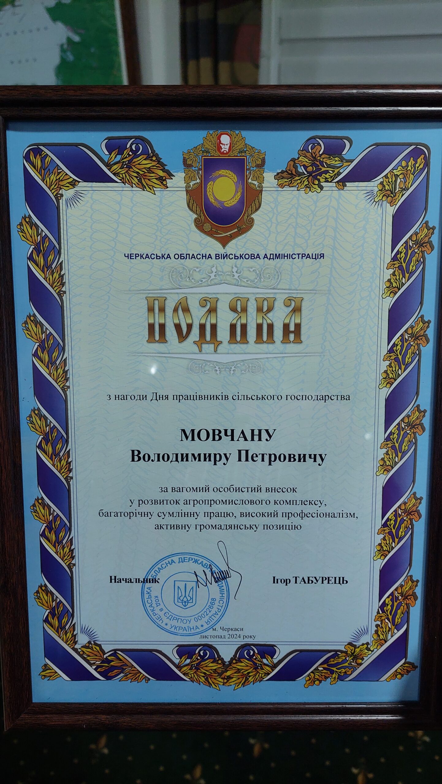 Очільник області привітав всіх працівників агросфери з прийдешнім професійним святом. Підприємцям з Тальнівщини Володимиру Мовчану та Ігорю Новицькому голова військової адміністрації вручив Подяки «За вагомий особистий внесок у розвиток агропромислового комплексу, багаторічну сумлінну працю, високий професіоналізм, активну громадянську позицію».