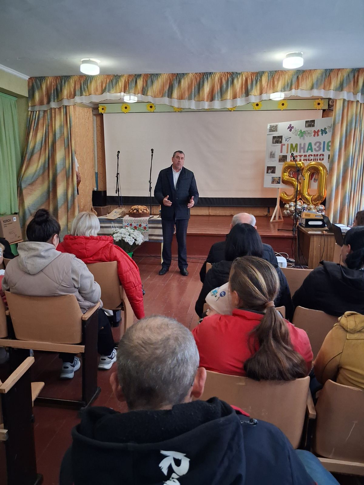 На заході був присутній заступник міського голови з питань діяльності виконавчих органів ради Юрій Свідерський, який привітав колектив гімназії з вагомим ювілеєм та подякував за віддану працю, освітній внесок у розвиток громади та виховання майбутніх поколінь.