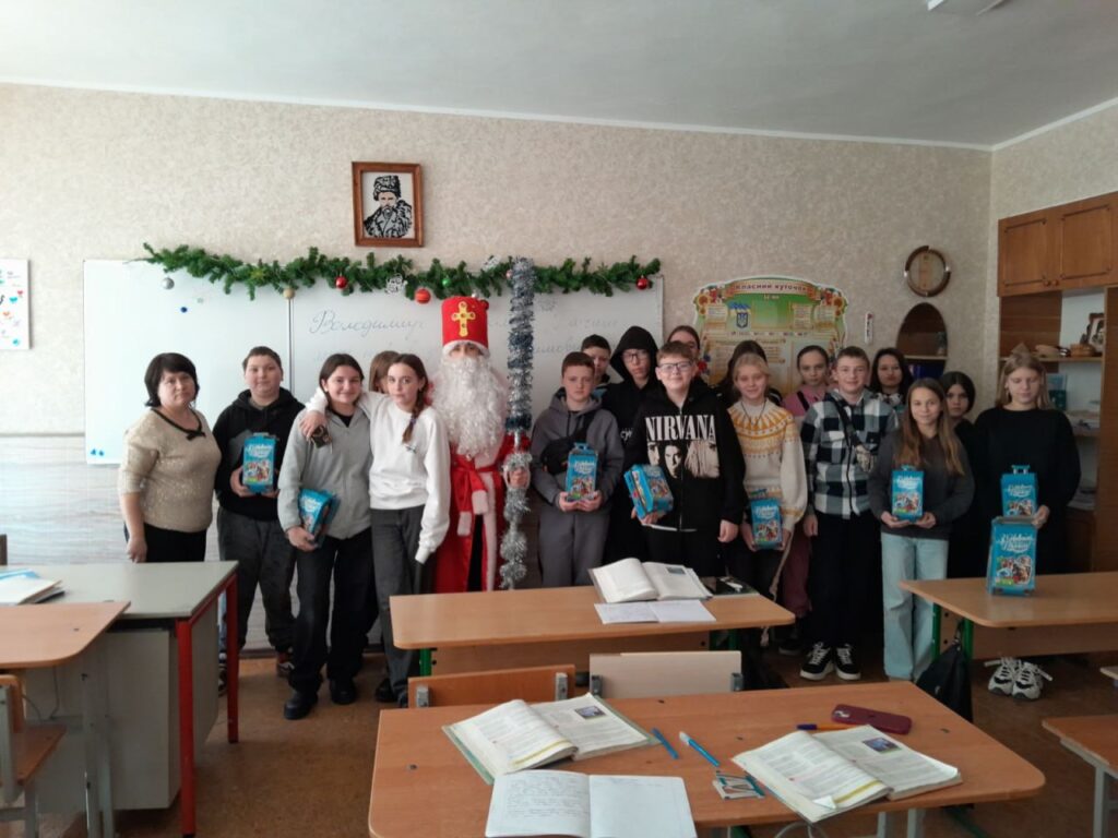 Торік на свято Миколая восьмикласники вирішили зробити 12 добрих справ – і впоралися із цим завданням. Упродовж року, після уроків, вони разом із класною керівницею допомагали “тальнівським павучкам” плести маскувальні сітки. Минулого року діти наколядували 8 тисяч гривень, які також передали для ЗСУ. За ці зусилля отримали подяку й прапор від 64-го окремого стрілецького батальйону.