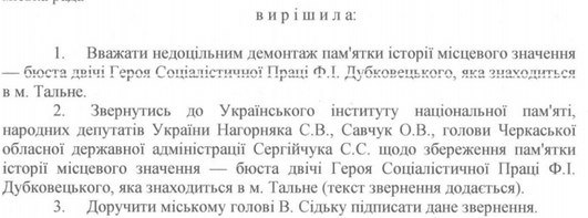 Рішенням від 21 грудня минулого року Тальнівська міська рада вирішила зберегти та визнати недоцільним демонтаж пам’ятника члену ЦК КПУ попри закон про декомунізацію. Про це свідчить надісланий до міської ради лист з Українського інституту національної пам’яті (УІНП).
