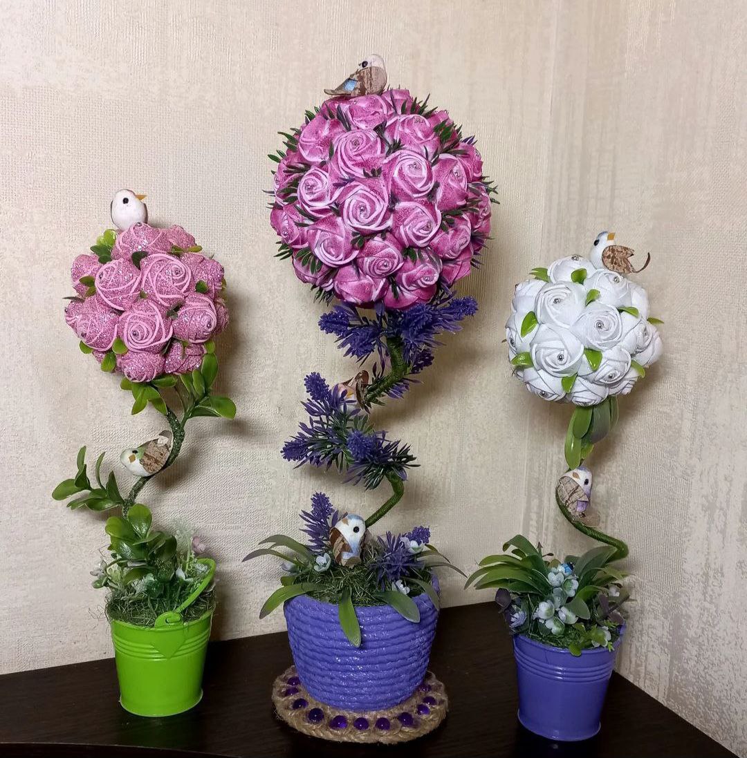 Використовуючи джут, картон, манну крупу, нитки, стрічки й природні матеріали, Лариса Миколаївна виготовляє великодні та різдвяні віночки, гніздечка, магніти на холодильник, обереги, панно, топіарії (дерева життя), усілякі трав’яні композиції, ялинкові іграшки. Усього – не осягнути, перелічити ще важче.