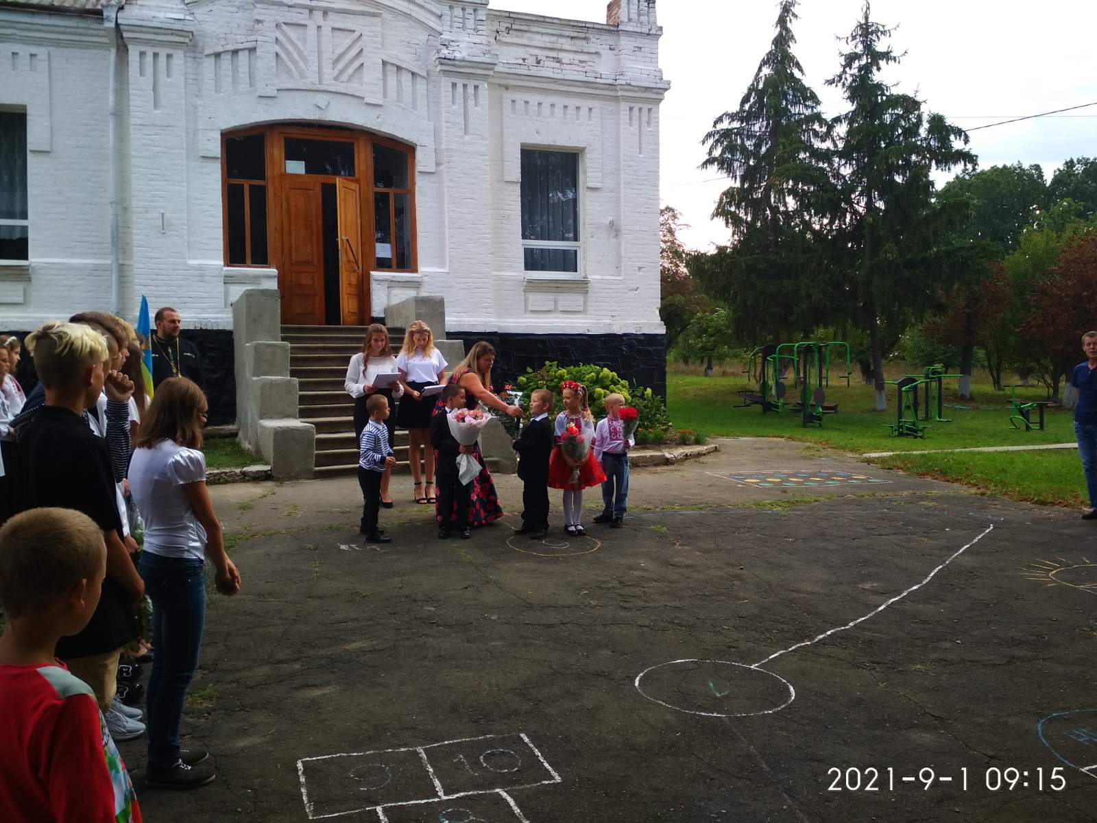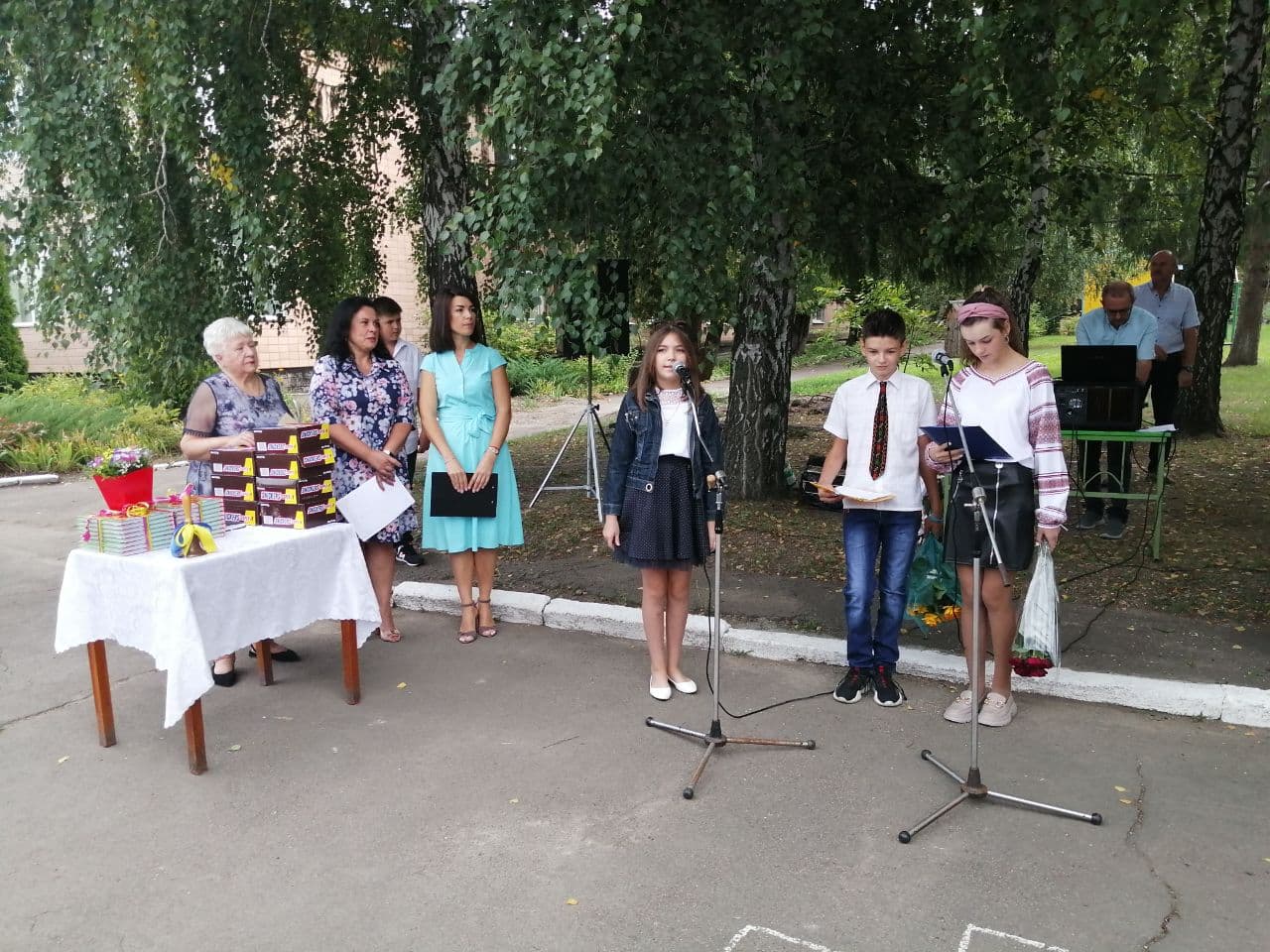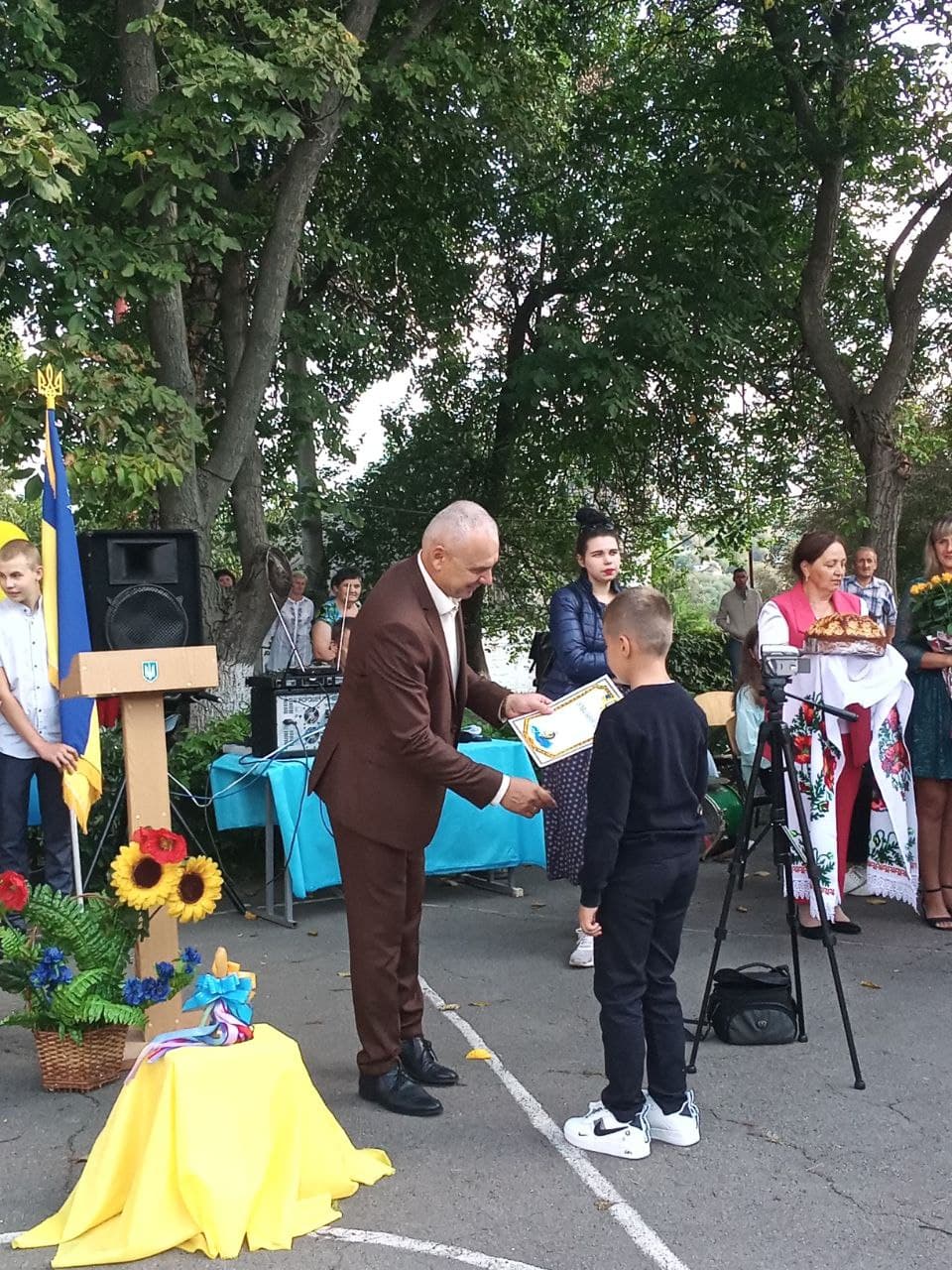 Таміла Володимирівна вручила похвальні листи та дипломи переможцям різноманітних конкурсів, подякувала дітям за успіхи. Батькам, технічним працівникам та вчителям – за допомогу в підготовці школи до нового навчального року, колишньому випускникові, а тепер успішному підприємцю Олександру Зінченку – за подарунки. Особливі слова подяки звучали з вуст директорки на адресу Людмили Денисівни Кутової, засновниці двох сільськогосподарських підприємств. Та, в свою чергу, привітала педагогічний колектив, директора школи, вчителів, батьків, учнів. Побажала всім миру, добра та здоров’я. Першокласникам, яких цьогоріч 16, подарувала по «Великій книзі повчальних казок», а 11-класникам – сертифікат на фотосесію. Для всіх учнів – солодкі подарунки. Отримавши по снікерсу, діти були на сьому небі від щастя. Не забули на святі згадати й будівничого школи Валентина Євгеновича Кутового – поклали квіти до меморіальної дошки.