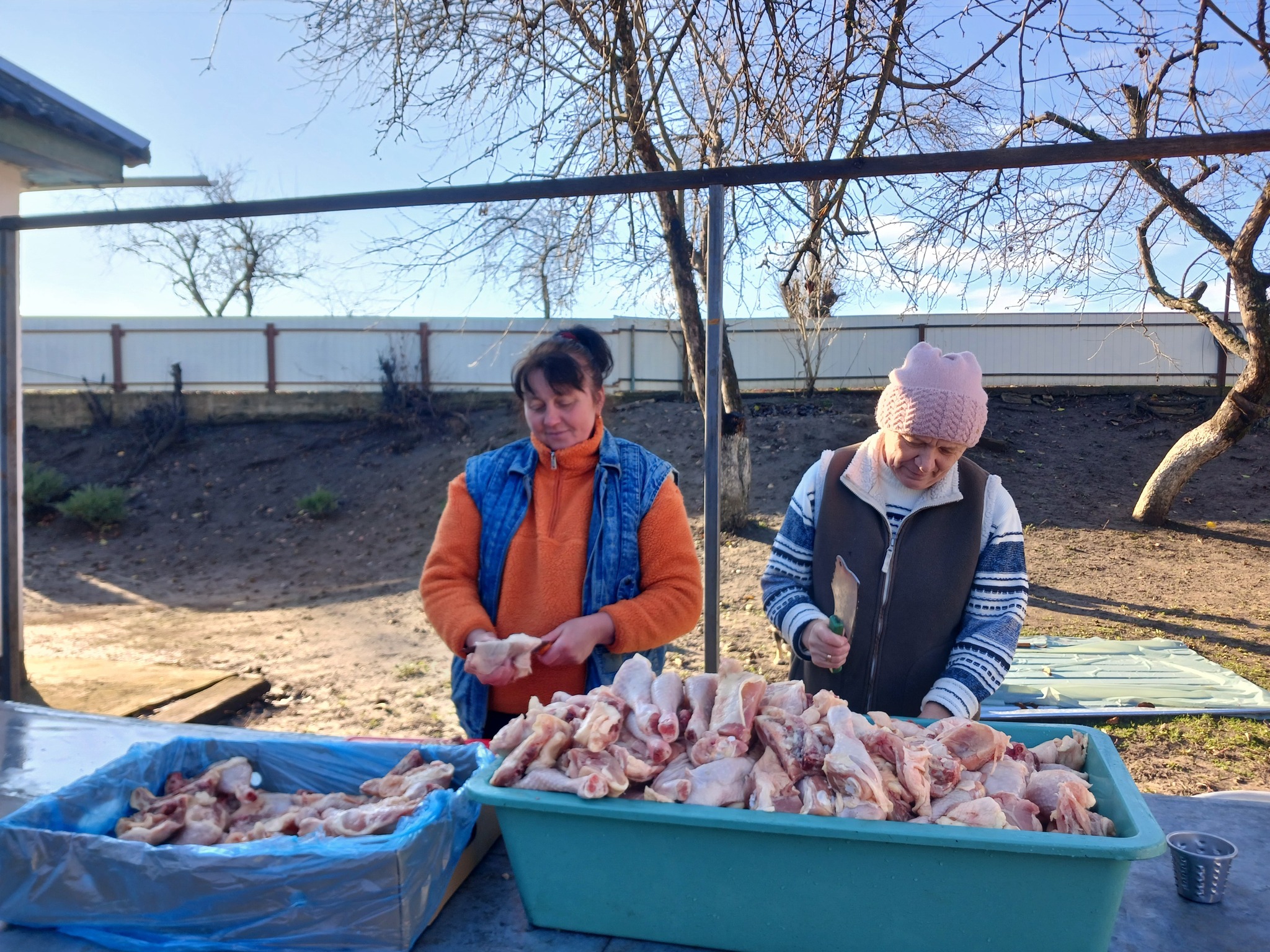 Попри холод і втому, Людмила Перцьова разом з Олегом Цимбалом минулого тижня побувала в ТОВ «АГРО-Рось» у селі Балаклея. Засновник підприємства Анатолій Семинога надав волонтерці 100 кілограмів курячого м’яса – саме те, що потрібно для приготування домашніх страв, які згодом поїдуть на позиції.