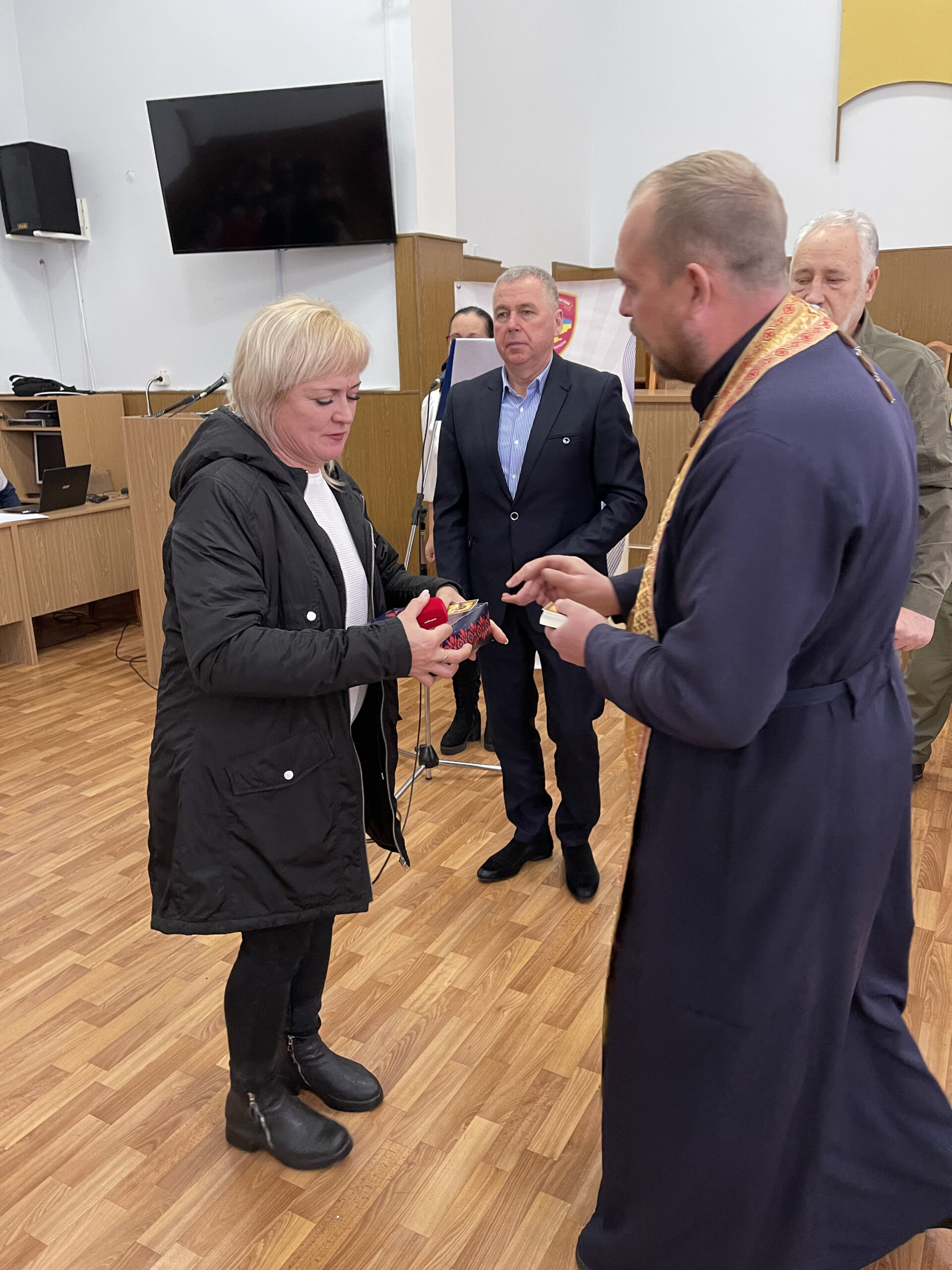 В урочистій атмосфері, в присутності міського голови Василя Сідька, представників військово-цивільної спілки «Бойове братерство України» на чолі з Павлом Жебрівським, благочинний Тальнівської громади Православної церкви України, протоієрей Андрій Гаргат, прочитав молебень та освятив водою медальйони, які стали важливим знаком любові та шани.