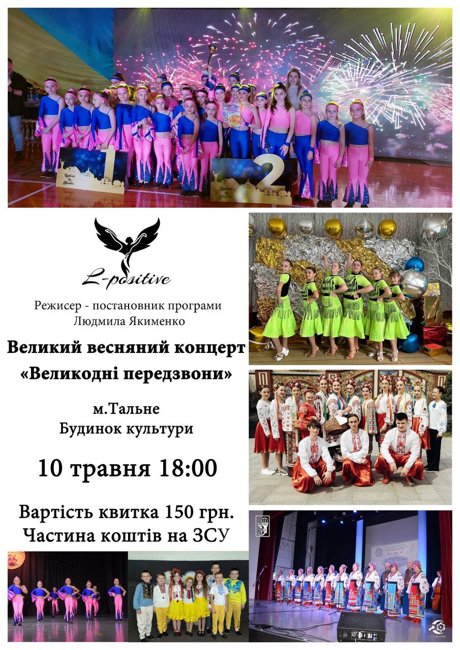 Творчі студії «L-POSITIVE» та «L-STUDIO» готують весняний благодійний концерт «Великодні передзвони». Захід відбудеться 10 травня о 18:00 у Тальнівському будинку культури на Черкащині.