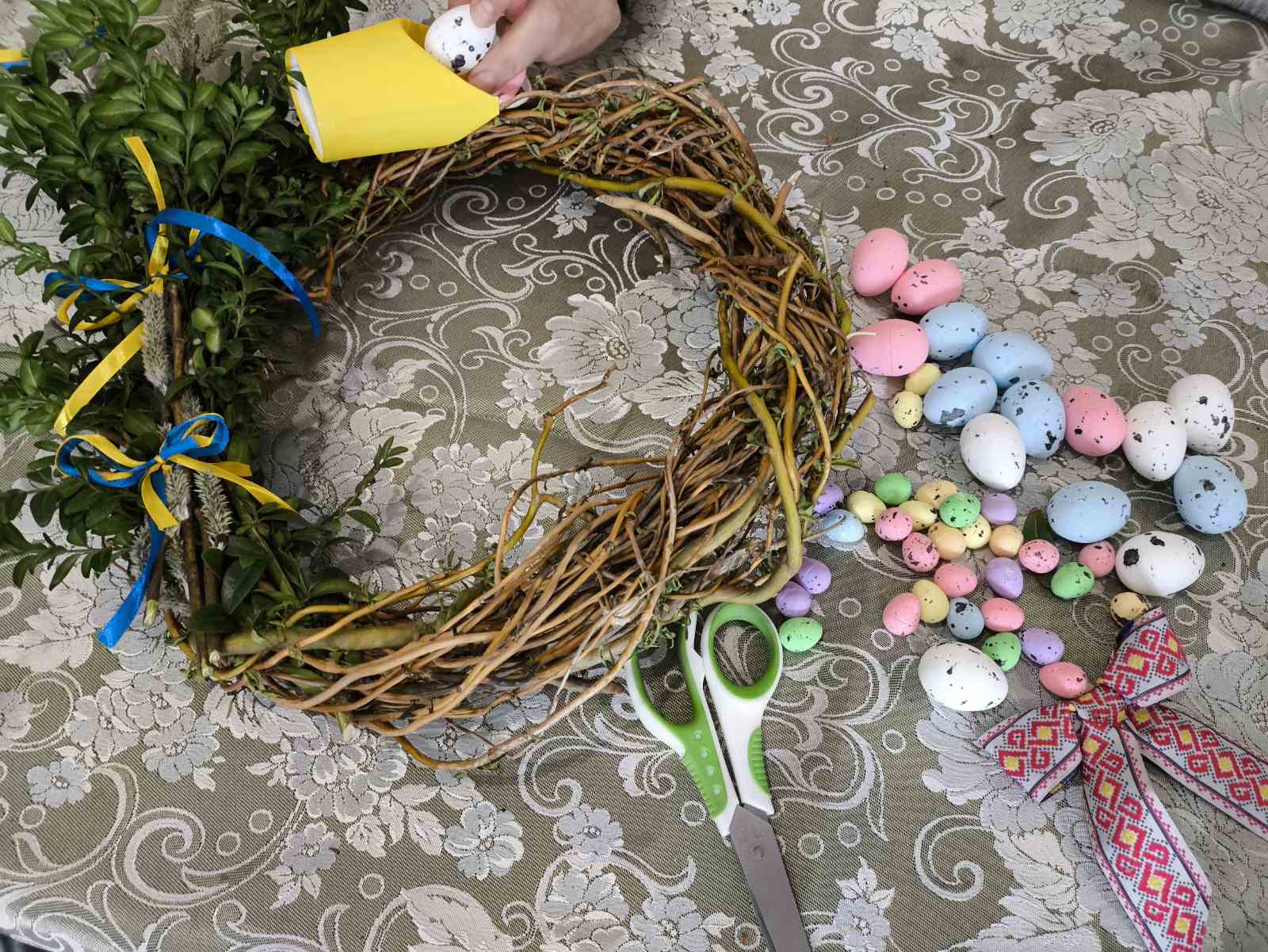 А Люся Чурпіта провела майстер-клас з виготовлення великоднього віночка. Барвистого, святкового, прикрашеного писанками, зеленню і, звісно, гілочками, що несли у собі дух свята.