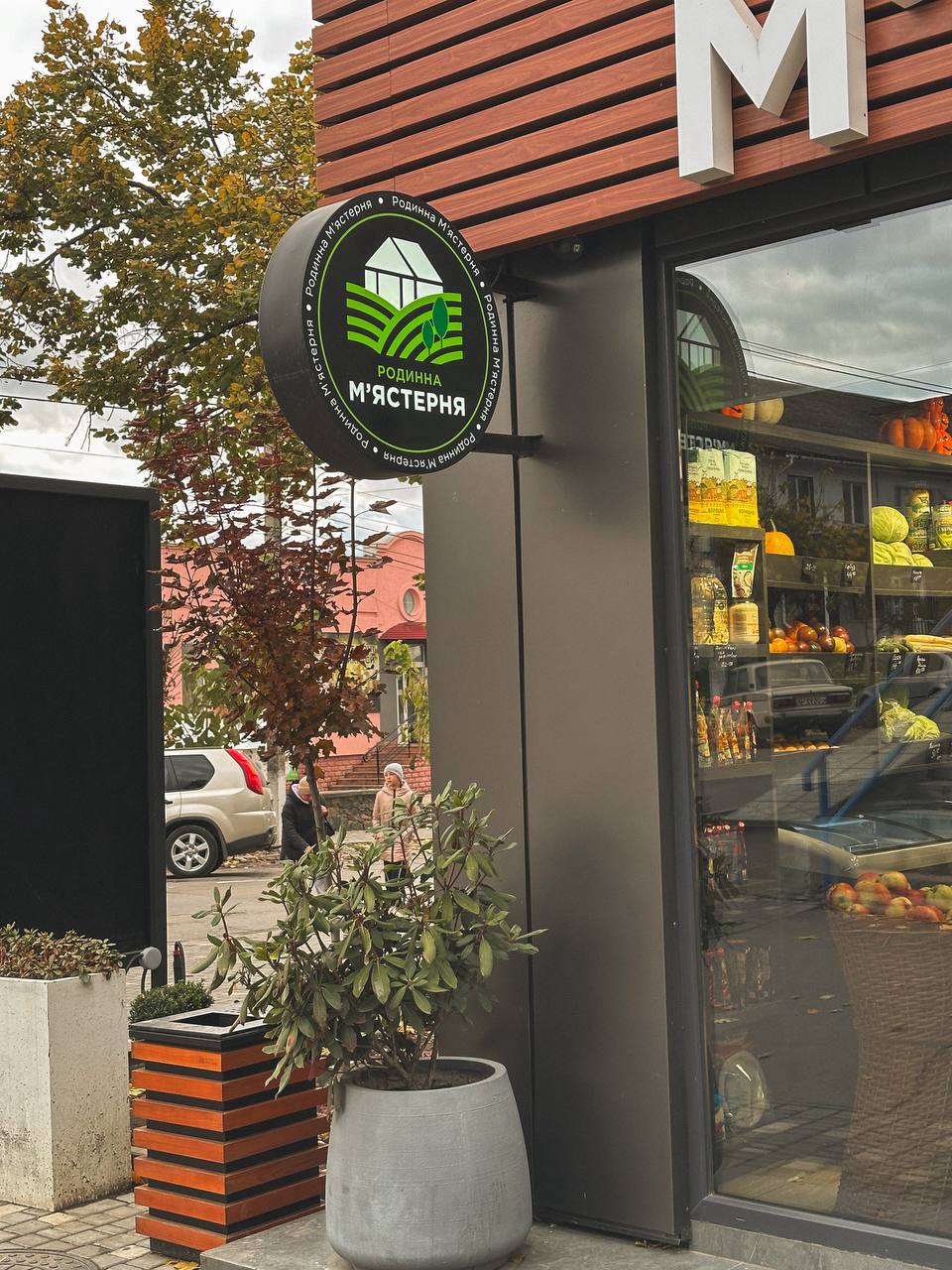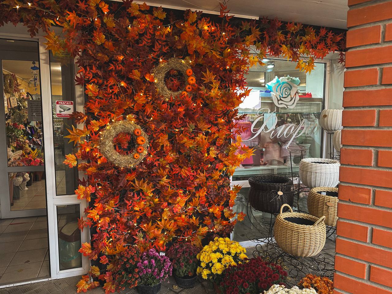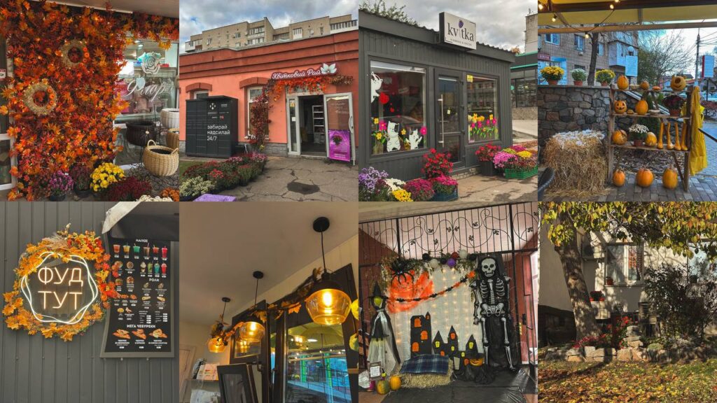 Особливо святковим став вигляд гіпермаркету «Материк», де облаштовано цілу фотозону – з гарбузами, снопами, кульками, гірляндами й осіннім листям. Не менш затишно виглядає магазин «Kvitka», біля якого стоять доглянуті горщики з квітами, та «Оазис», де вхід потопає у розмаїтті вазонів.