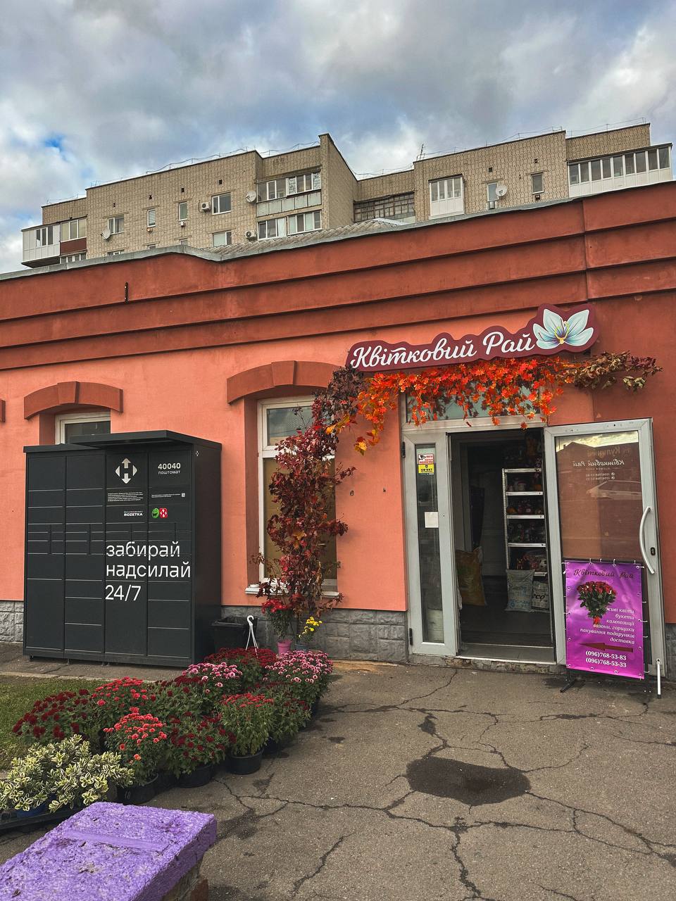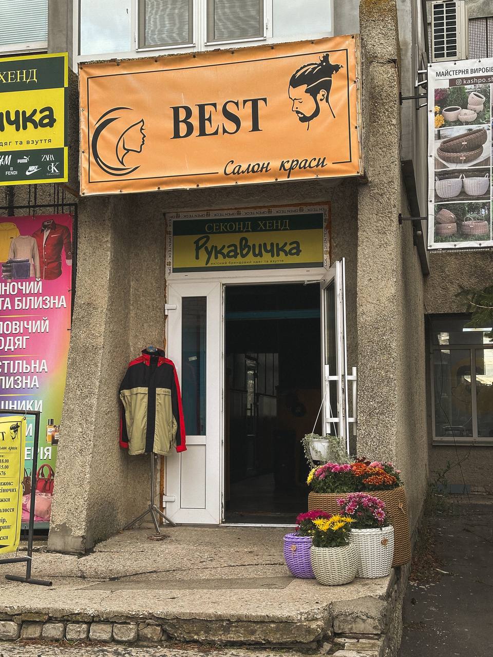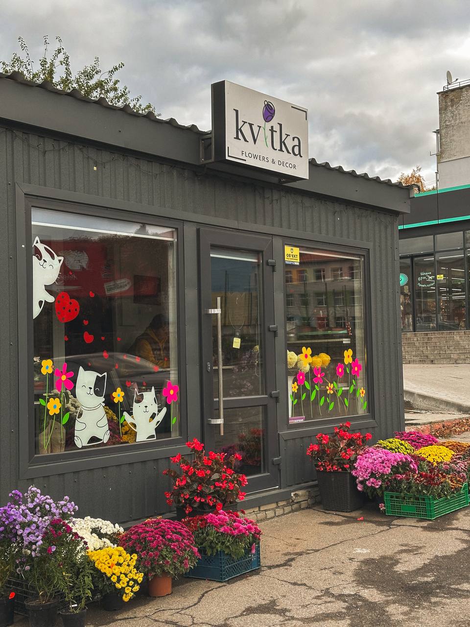 Особливо святковим став вигляд гіпермаркету «Материк», де облаштовано цілу фотозону – з гарбузами, снопами, кульками, гірляндами й осіннім листям. Не менш затишно виглядає магазин «Kvitka», біля якого стоять доглянуті горщики з квітами, та «Оазис», де вхід потопає у розмаїтті вазонів.