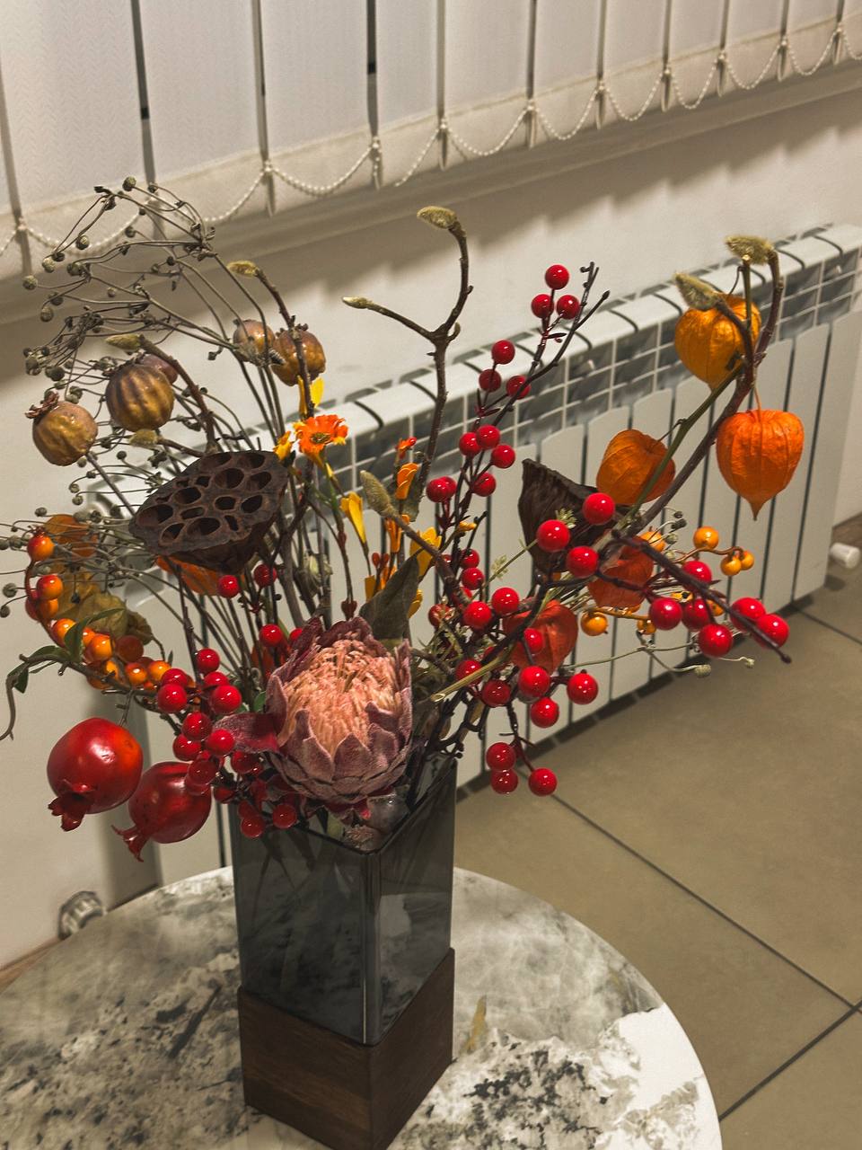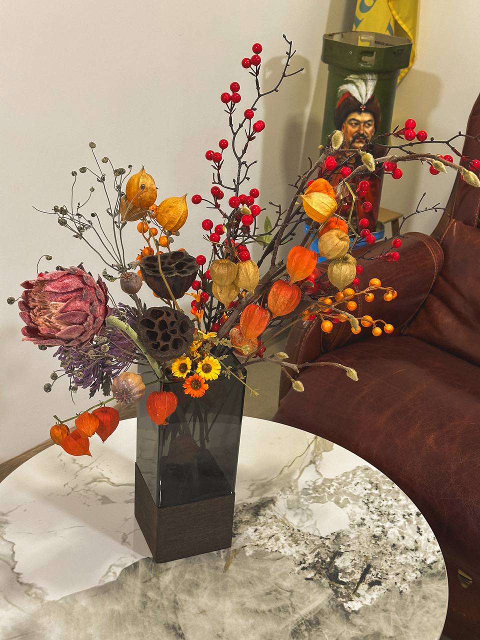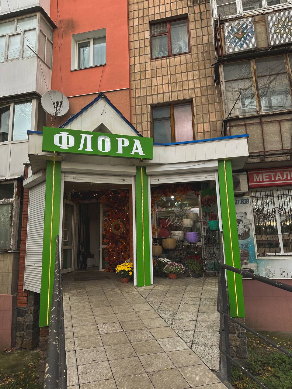 Осінній настрій зустрічає тальнівців уже біля магазину «Кібернетики», де фасад прикрашено гірляндами та кульками. Сусідній «Квітковий Рай» перетворився на справжню локацію затишку: гірлянда з листя, стовп у вигляді дерева та вазони з хризантемами привертають увагу кожного перехожого. Поруч – «Світ посуду», біля якого розквітли хризантеми в горщиках.