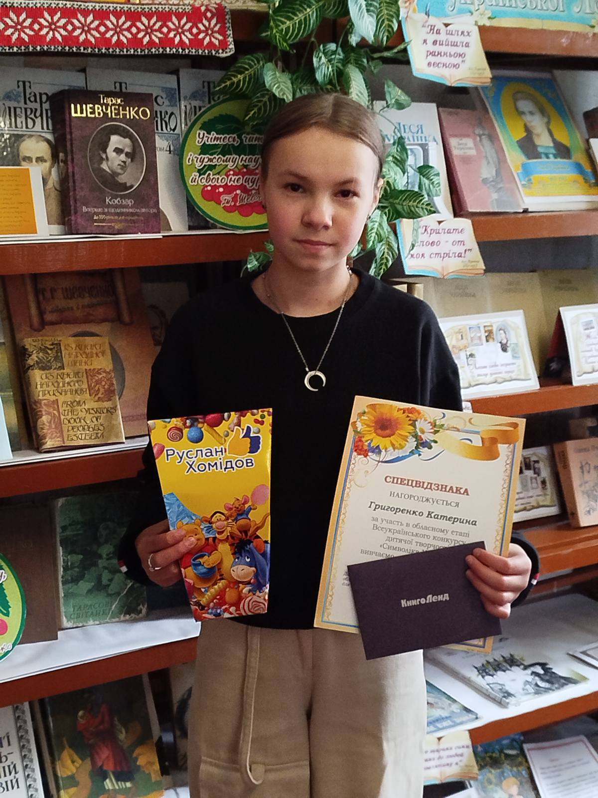 Коли Галина Володимирівна дізналася про конкурс, одразу запропонувала дітям надіслати свої роботи. Якою ж приємною стала звістка про те, що Асія посіла перше місце! Переможниця отримала диплом, солодощі та сертифікат на придбання книжок від «Книголенду».
